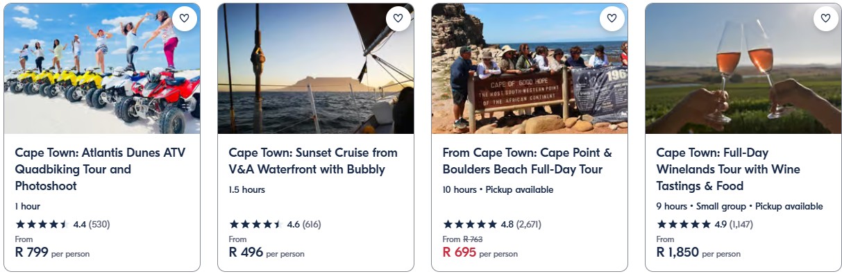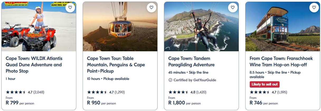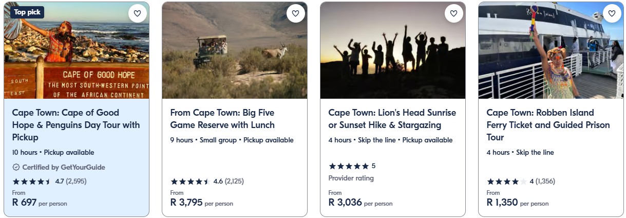 In Cape Town, you can visit iconinc landmarks like the Table Mountain Cableway, Boulders Beach to see penguins, and the V&A Waterfront. Other popular activities include exploring Kirstenbosch National Botanical Garden, taking a trip to Cape Point Nature Reserve, and visiting the Robben Island Museum. For those interested in culture and history, the Bo-Kaap neighborhood and the District Six Museum are great options.